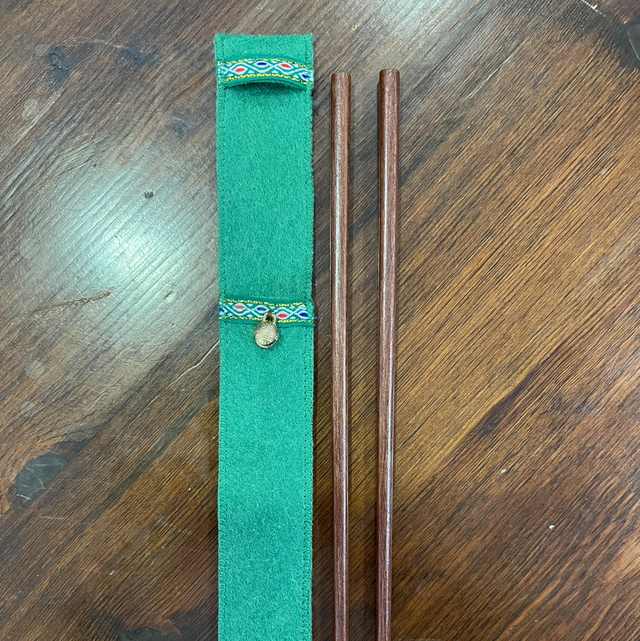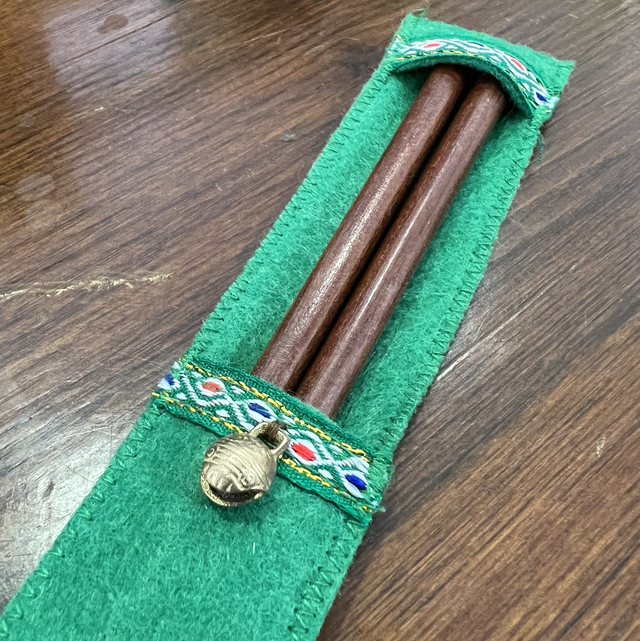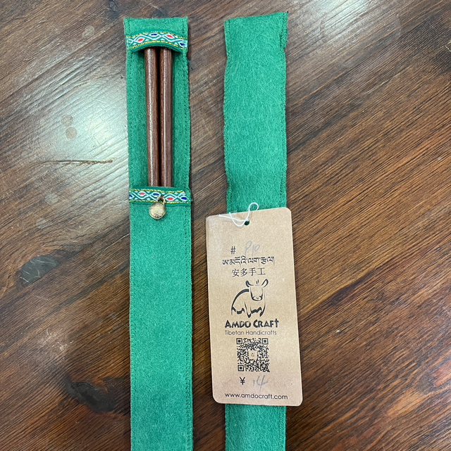 Entièrement en bois et présentées dans un jolie fourreau vert, ces baguettes sont élégantes, simples et pratiques. EIl est possible d'en détourner l'usage pour en faire des baguettes pour cheveux.